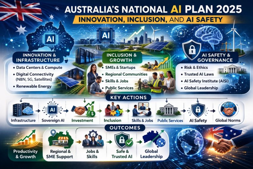 The Australian National AI Plan 2025 (NAP) adopts a whole-of-economy and whole-of-society approach. This NAP has been issued by the Australian Government Department of Industry, Science and Resources. Through this NAP, it ensures that AI will drive productivity and innovation and benefit all Australians. The NAP will ensure that only big tech companies or metropolitan areas will not benefit in zero-sum manner. The NAP operates within strong legal, ethical, and safety boundaries. The three core goals of the NAP are capturing opportunities, spreading benefits, and keeping Australians safe.